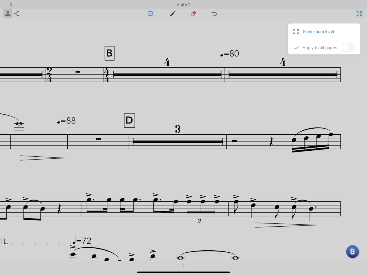 Users have the ability to zoom in on any portion of a part or score and save that zoom level so that every time that page or part is opened, it is opened at that specific zoom level.