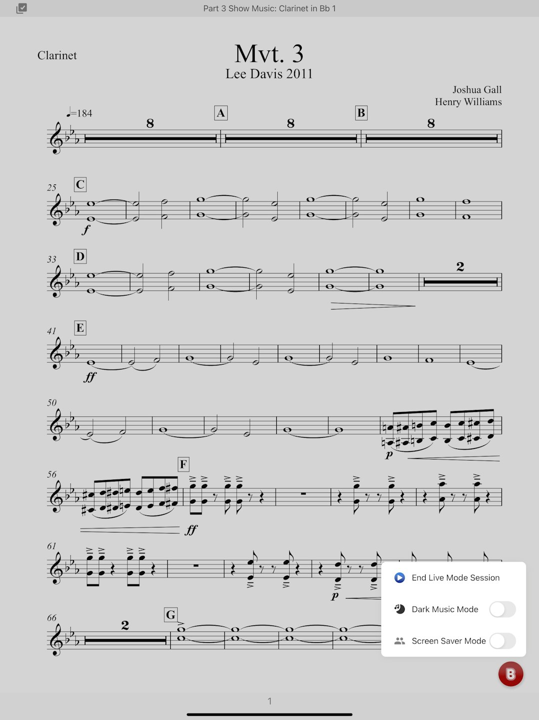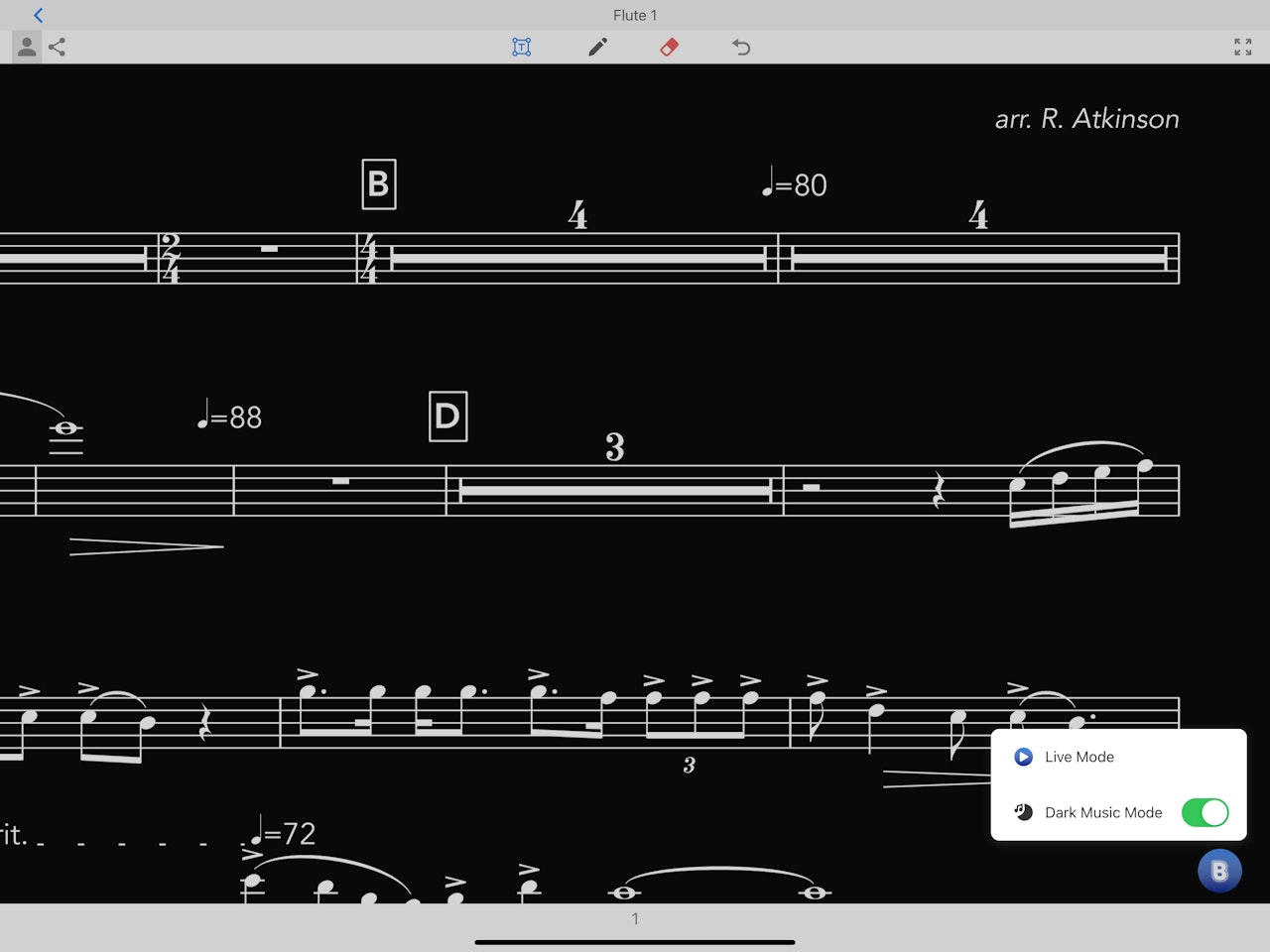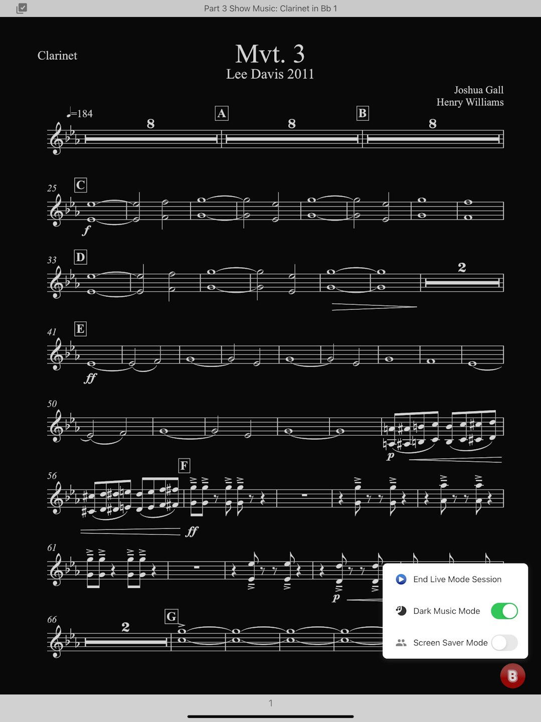As mentioned above, Dark Music Mode can be accessed by tapping on the Beam Button. It will invert the the colors on the screen, allowing you to eliminate glare on the screen, or view the music more easily in overly bright or dim venues.