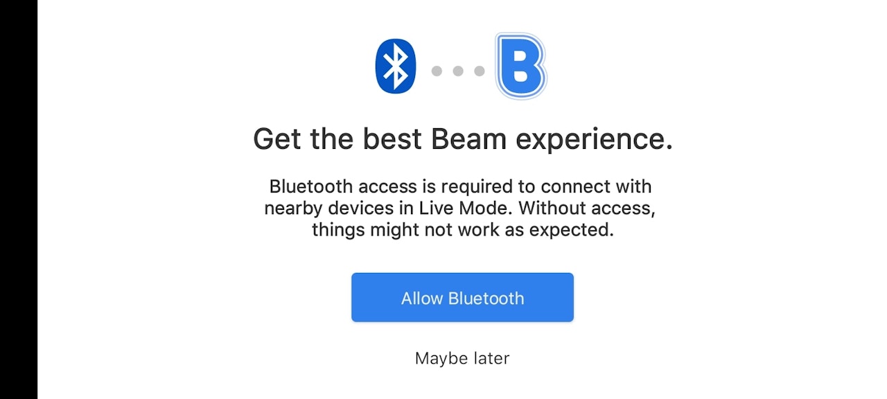 Due to the use of this technology within the app, Beam asks permission for the use of Bluetooth and WiFi to connect and sync with nearby devices. You will be asked to accept these two permissions after you create your account and enter the ensemble for the first time. Only by accepting these permissions will you be able to fully experience all that Beam has to offer with Live Mode and Global Annotations.